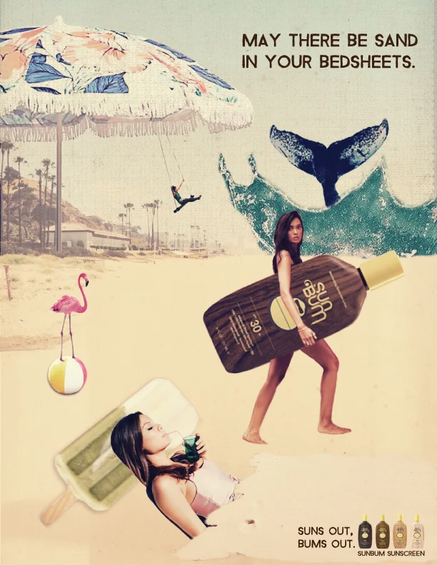 Our target audience is millennials who are free spirits, enjoy outdoor activities like surfing/music festivals, and are also beach bums. For our target, a day at the beach isn't an activity, but a way of life. Our eclectic, quirky collage ads appeal to our target and send them the message to live the Sun Bum lifestyle.